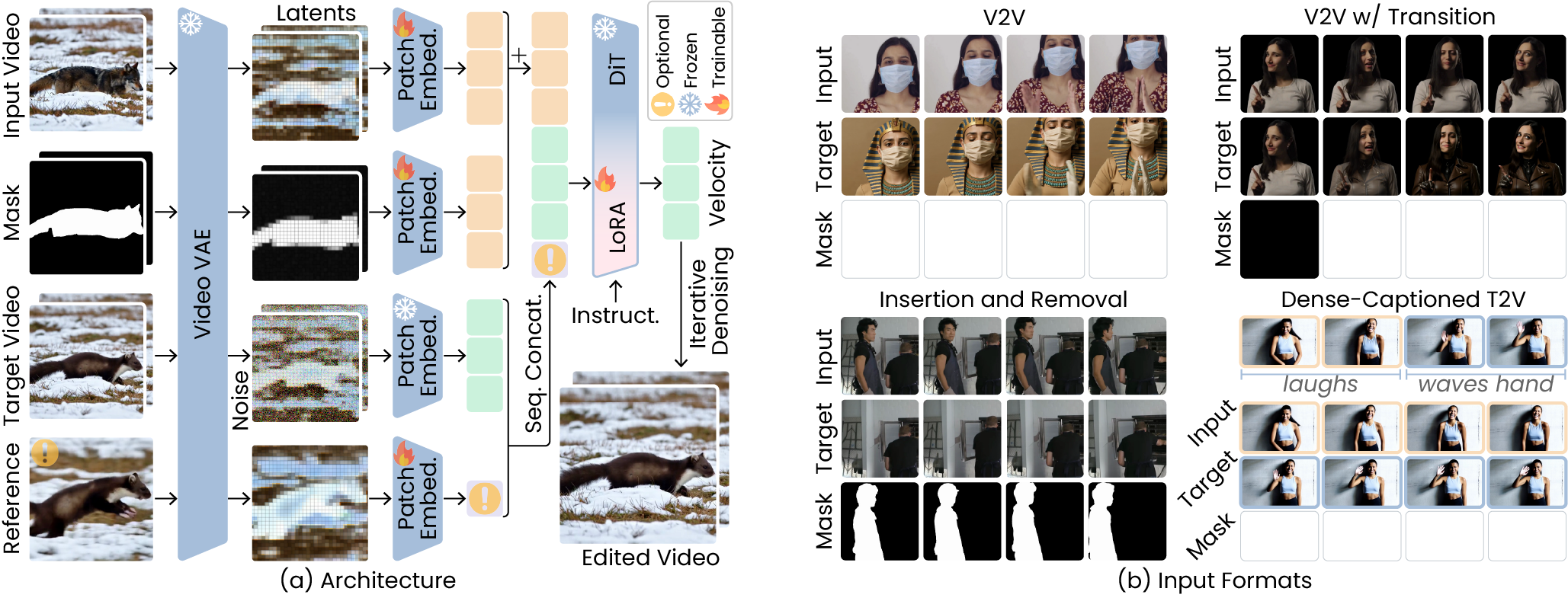 (a) Overview of our video editing architecture. The frozen video VAE encodes control signals. Mask tokens are added to the input video tokens and concatenated with the noisy latent tokens and optional reference image. The DiT is trained using LoRA.