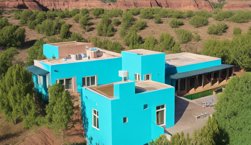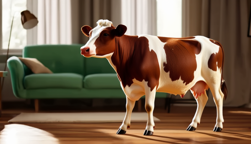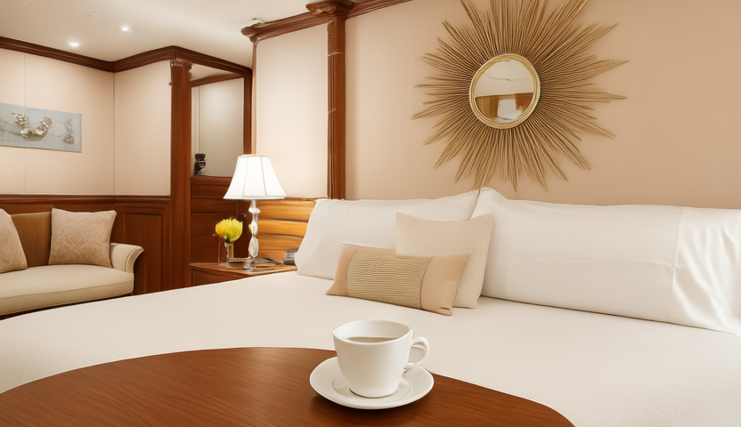 add a modern sculpture made of polished steel in the center of the room, reflecting the sunlight.