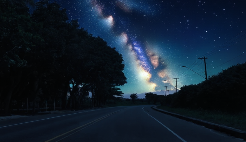 Transform the scene into a surreal, infinite highway that stretches into a starry void, where the trees are shadows of galaxies, and the road leads to a portal in the sky.