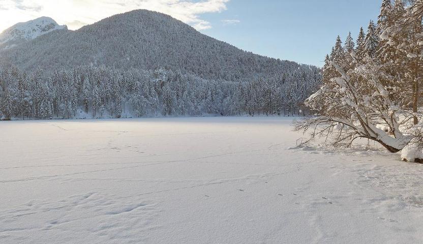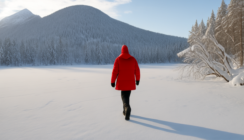 Add a person wearing a red winter coat and black snow pants walking across the snowy field near the center of the image.