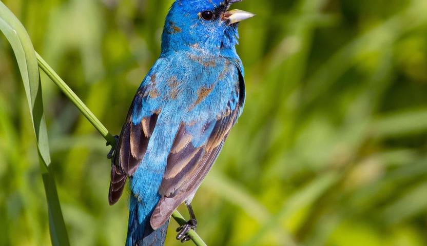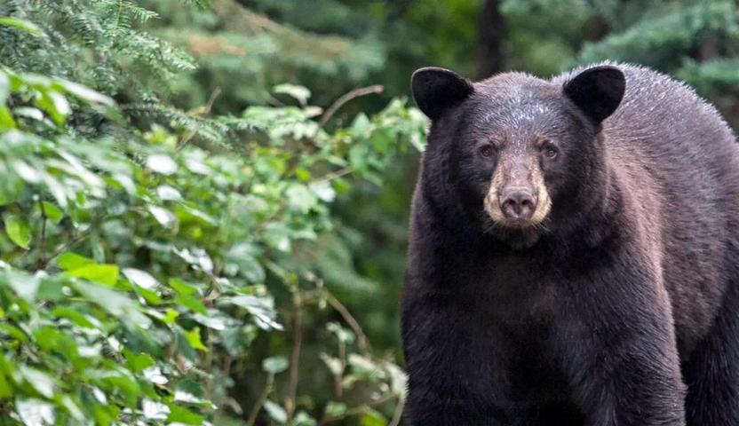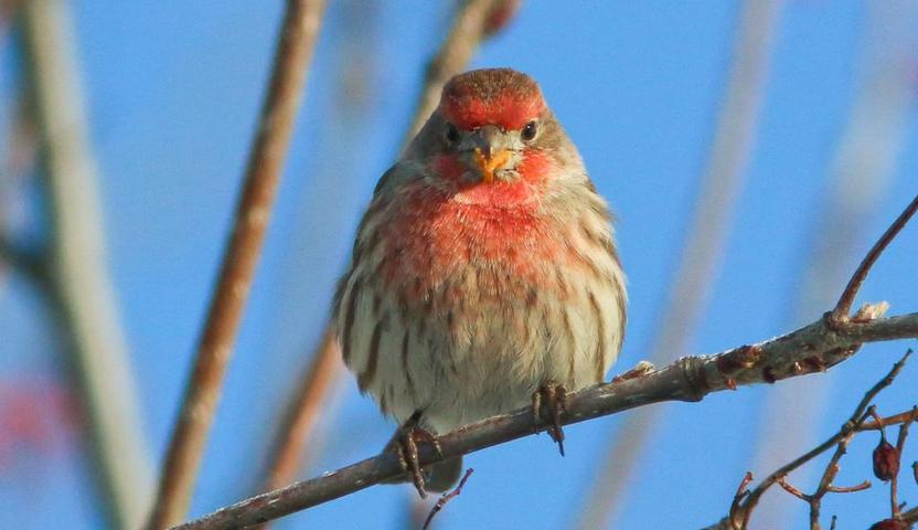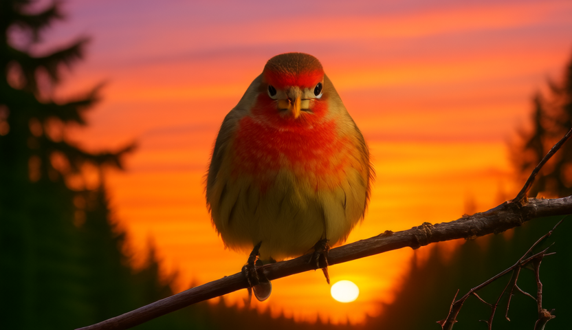 Change the background from a clear blue sky with bare branches to a sunset sky over a lush forest.
