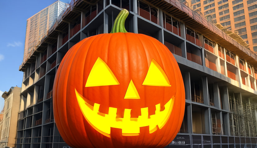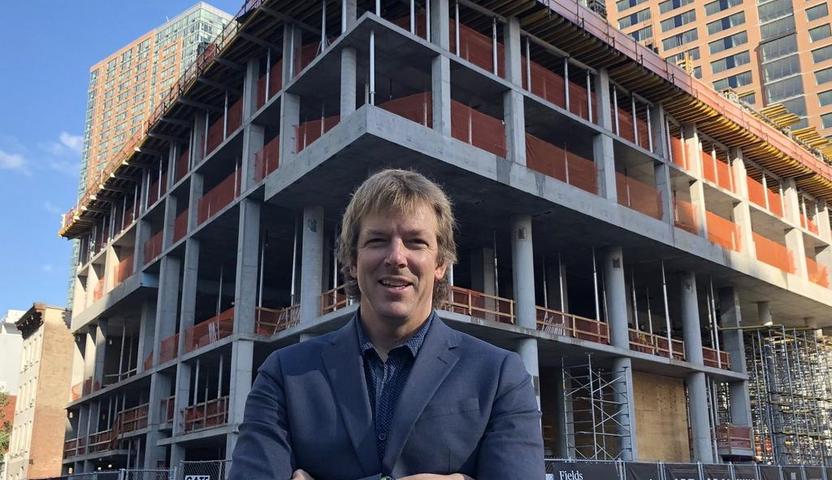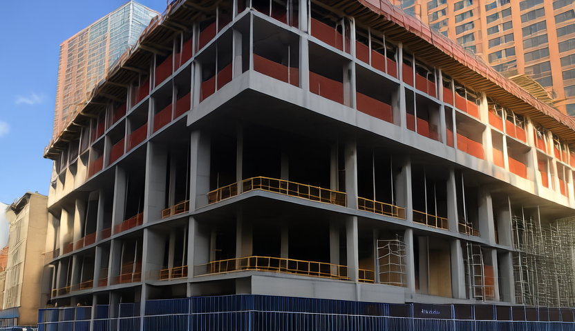 Remove the human standing in the foreground wearing a blue suit, who is positioned in front of the construction site.