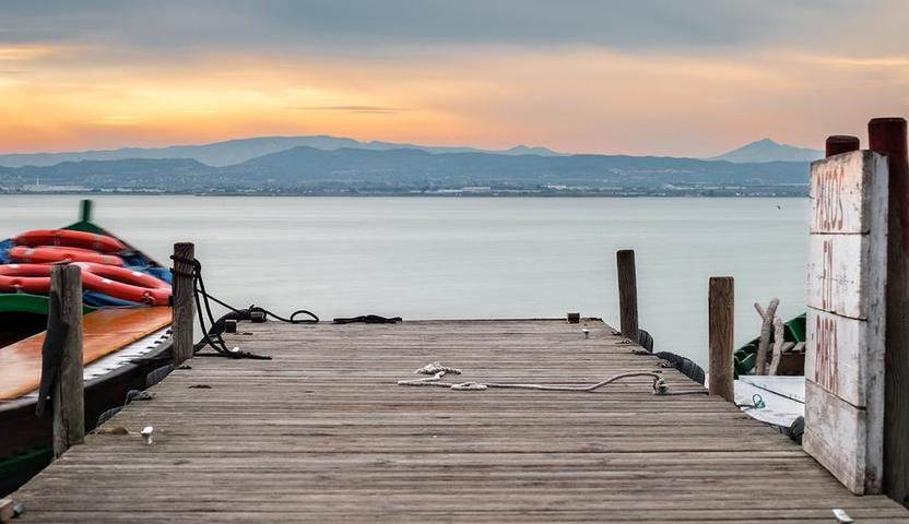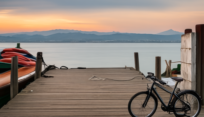 Add a bicycle leaning against the pier in the foreground, positioned near the left side of the dock.